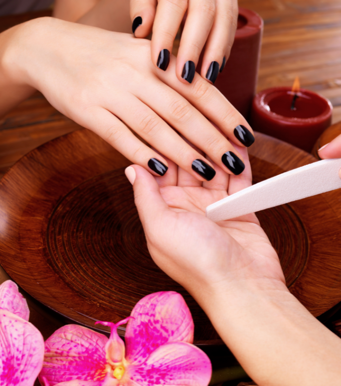 We Start off filling and trimming down your fingernails. After we push back your cuticle and cut off any excess skin. Then we provide a lotion massage to relax your arms.